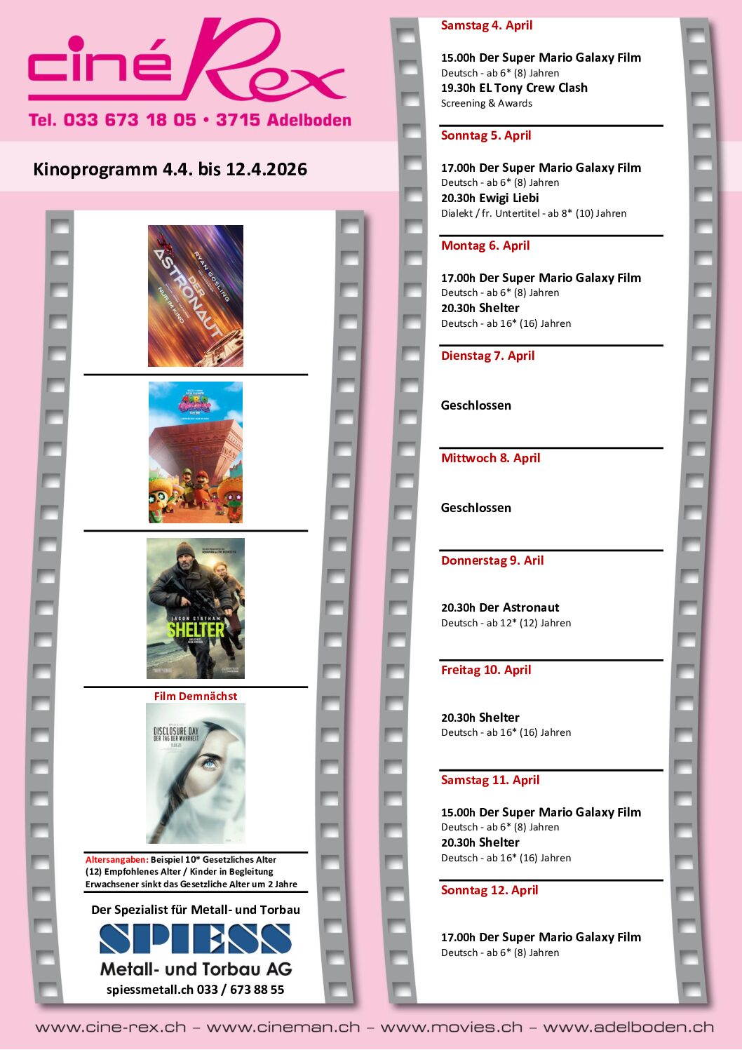 Bleiben Sie stets auf dem Laufenden über die neuesten Blockbuster, fesselnde Dokumentarfilme und exklusive Sonderveranstaltungen, die in unserem Kino laufen. Egal, ob Sie einen gemütlichen Filmabend planen oder das nächste grosse Kinoevent nicht verpassen möchten, unser Programm bietet für jeden Geschmack etwas.